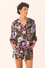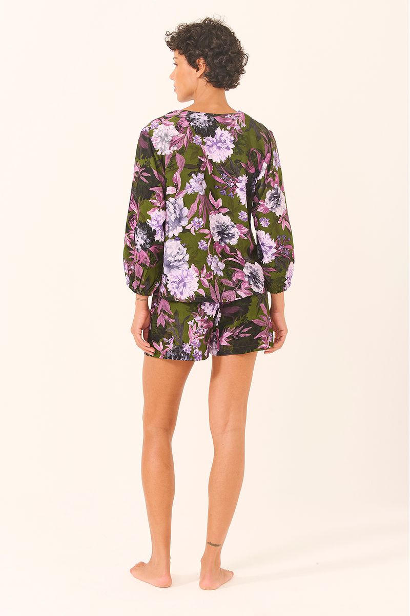 Conjunto Manga Bufante Manacá em tecido leve e macio, composto por blusa de mangas curtas bufantes com decote em V e short de modelagem soltinha com cós elástico. A estampa floral em fundo verde traz vivacidade e delicadeza, enquanto o caimento garante conforto e estilo para momentos de descanso ou produções casuais descontraídas.