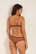 Com taças de tule transparente, ele traz uma leveza sensual, deixando a pele à mostra de forma sutil. A cor terra, suave e elegante, combina bem com diferentes tons de pele, oferecendo uma opção discreta e ao mesmo tempo charmosa.