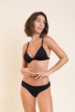 Calcinha modelo biquíni na cor preta em poliamida. Não possui costura no bumbum, sendo uma ótima aliada ao usar roupas mais justas. Lateral de três dedinhos, aproximadamente 4,5 cm de largura.