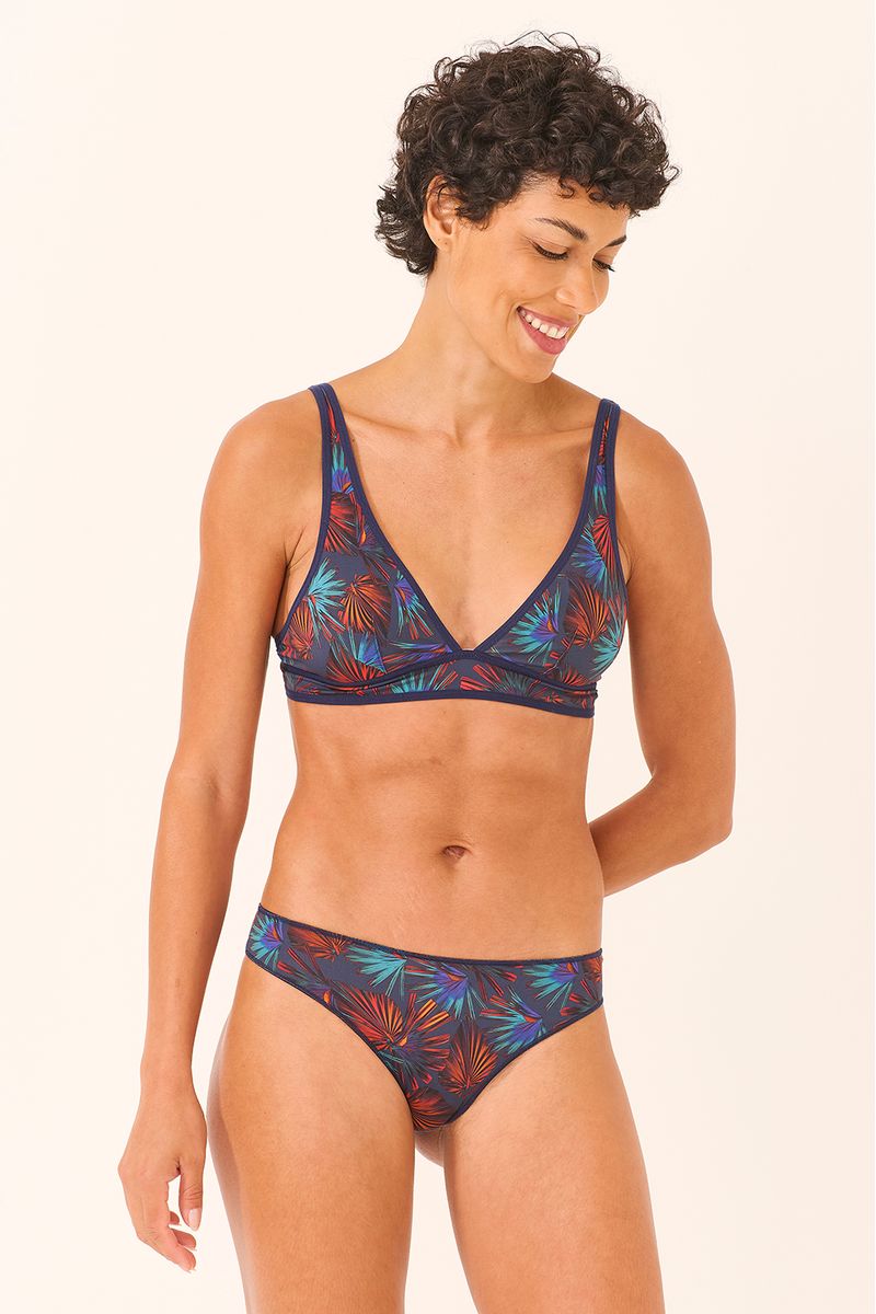 Com modelagem clássica e confortável, essa calcinha oferece cobertura equilibrada e caimento perfeito para o dia a dia. Feita em microfibra macia, proporciona toque suave e bem-estar. A estampa Ráfia, em folhas coloridas sobre fundo azul-marinho, adiciona frescor e estilo à peça.