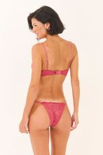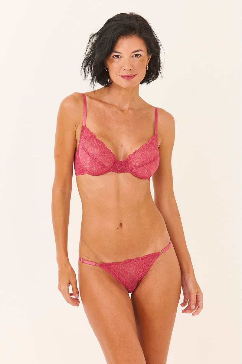 Leve e charmosa, a calcinha tanga em renda rosa goiaba combina a delicadeza da renda com uma modelagem confortável e feminina. O desenho floral traz romantismo, enquanto o tom vibrante adiciona frescor à peça. Ideal para o dia a dia com um toque de sensualidade sutil.