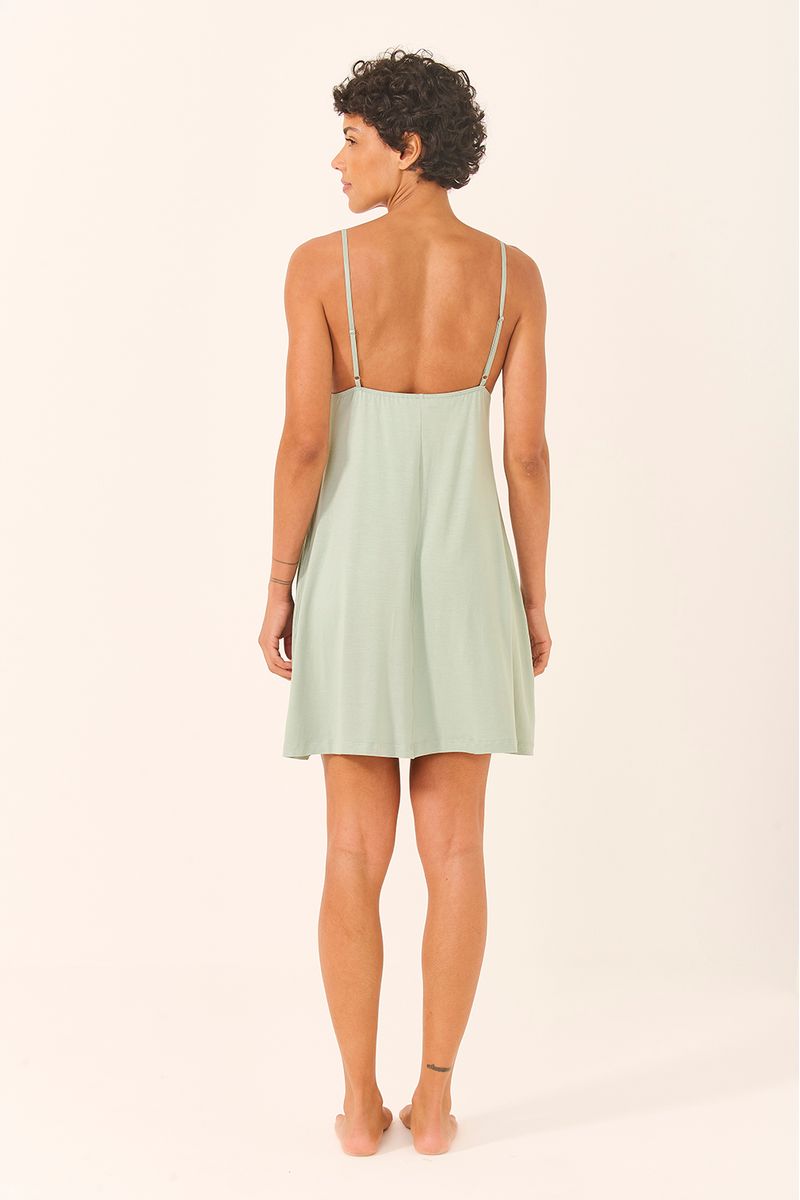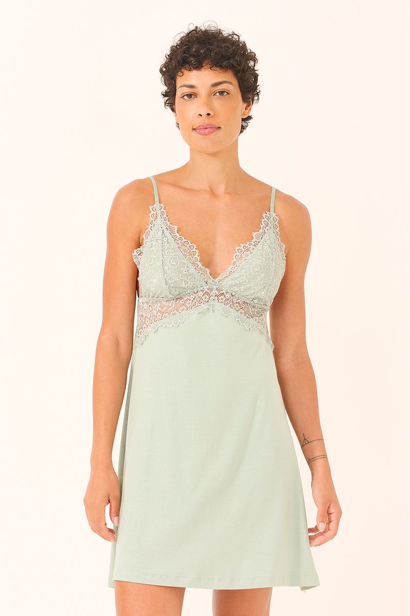 Camisola Busto Renda Verde Orvalho em malha macia e leve, com busto e recorte abaixo do seio em renda delicada. Possui alcinhas finas reguláveis e caimento fluido que garante conforto e elegância. O tom suave de verde traz frescor e leveza, ideal para noites de descanso com charme e feminilidade.