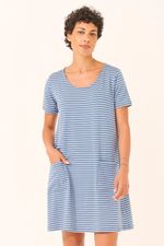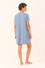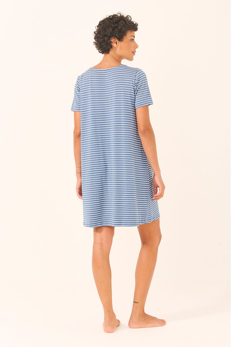 Com modelagem soltinha e bolsos laterais, essa camisola é puro aconchego. Feita em malha leve e respirável, tem estampa listrada clássica em azul e off, que traz frescor e um toque marinho ao look de casa. Ideal para relaxar com conforto e estilo todos os dias.