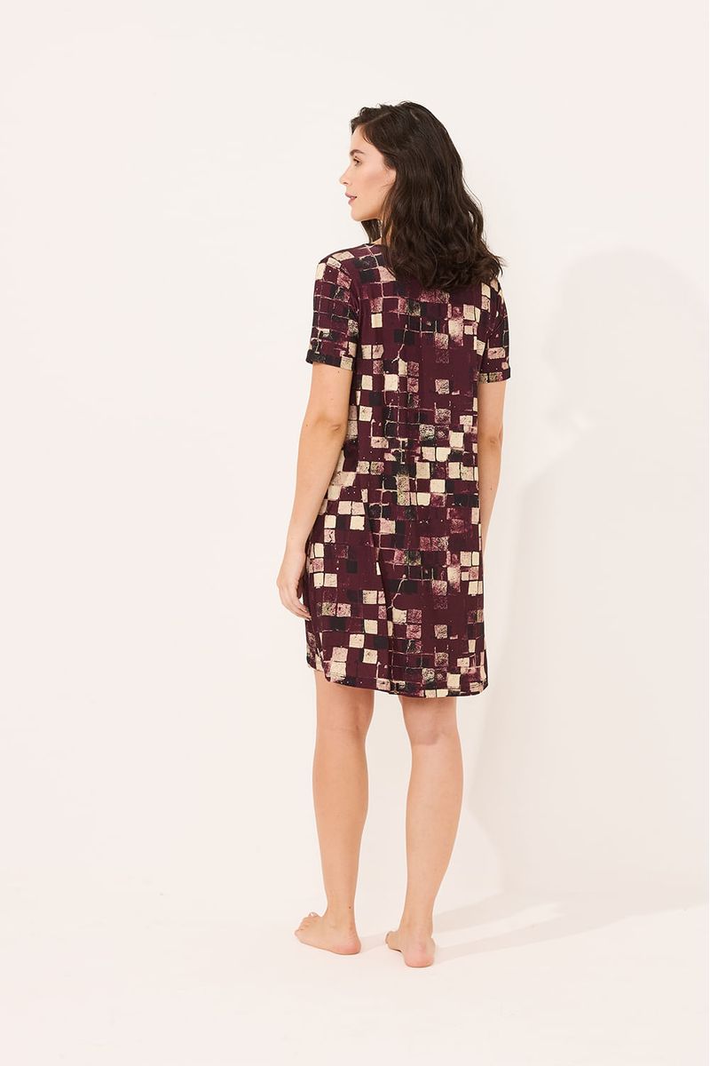 Seu charme está na estampa em mosaico, com quadrados irregulares em tons de vinho, bege e preto, criando um efeito artístico e moderno. O decote redondo e as mangas curtas completam o visual descomplicado, ideal para quem busca conforto sem abrir mão de estilo.
