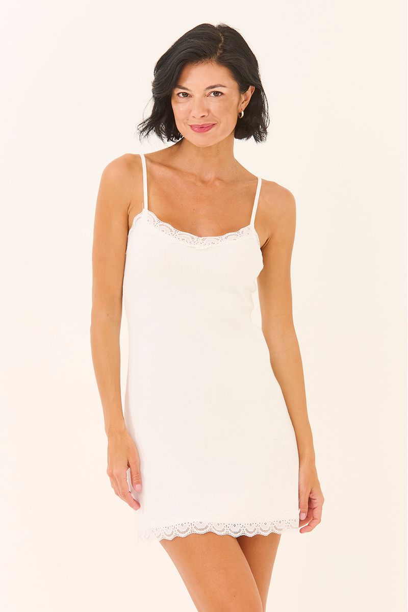 Delicada e confortável, a camisola em malha canelada off white oferece um toque macio e um caimento leve. O decote adornado com renda adiciona feminilidade e charme à peça, criando um visual romântico sem abrir mão do conforto. Perfeita para noites tranquilas ou momentos de relaxamento.