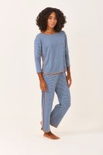 Conjunto 7/8 Vivo Azul Atlântico/Off, em malha leve e macia, com listras clássicas e toque aconchegante. A blusa de mangas 7/8 tem modelagem solta e acabamento arredondado, enquanto a calça reta traz caimento fluido e vivo contrastante que contorna o corpo com sutileza. Ideal para relaxar em casa com conforto e estilo — um clássico moderno que combina bem com o ritmo leve dos dias tranquilos.