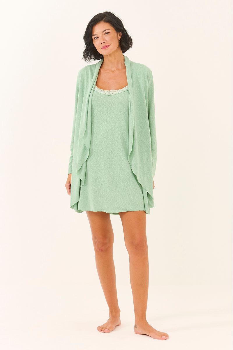 Delicado e versátil, o conjunto combina a camisola em malha leve verde acqua com detalhe em renda no busto e um cardigan longo de mangas amplas. A camisola tem caimento suave e toque fresco, enquanto o cardigan adiciona aconchego e elegância à composição. Um duo perfeito para relaxar com conforto e estilo.