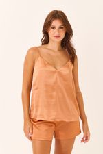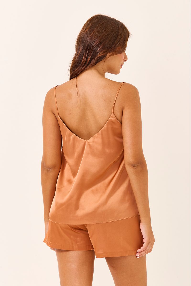 O Conjunto Curto de Alcinha em Cetim Dourado oferece luxo e frescor para o verão. O cetim de toque sedoso e brilho elegante proporciona um caimento leve. Com regata de alcinha e decote V, e short soltinho, é perfeito para relaxar em casa com sofisticação ou para um visual noturno elegante.