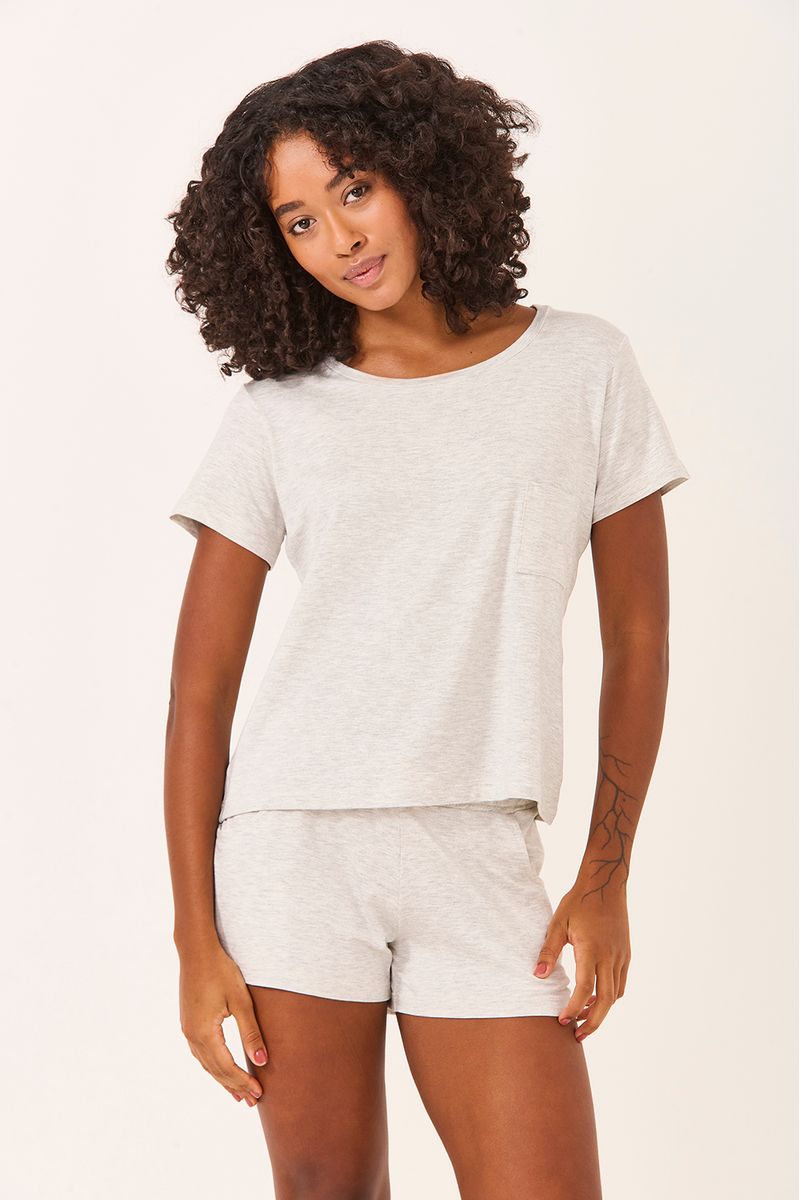 Conjunto Curto Bolso Mescla Claro, em malha macia e leve que garante frescor e conforto ao vestir. A blusa tem modelagem soltinha com bolso frontal e decote redondo, enquanto o short com cós elástico oferece ajuste confortável. O tom mescla claro confere um visual neutro e moderno — ideal para noites relaxantes ou dias tranquilos em casa.