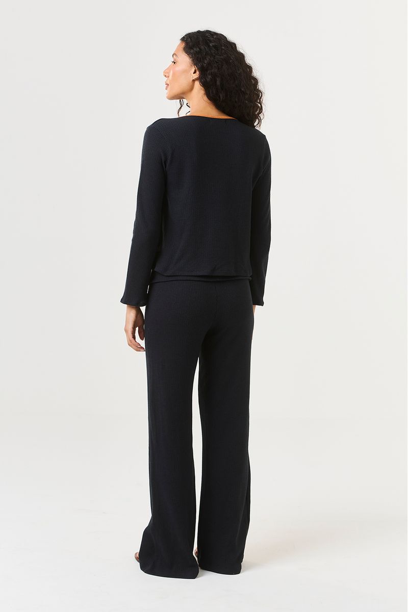 A blusa de manga longa possui abertura frontal com amarração em laço, criando um visual delicado e feminino, enquanto o contraste em ocre destaca o acabamento e traz personalidade à peça. A calça longa, com modelagem levemente flare, alonga a silhueta e garante movimento e elegância.