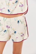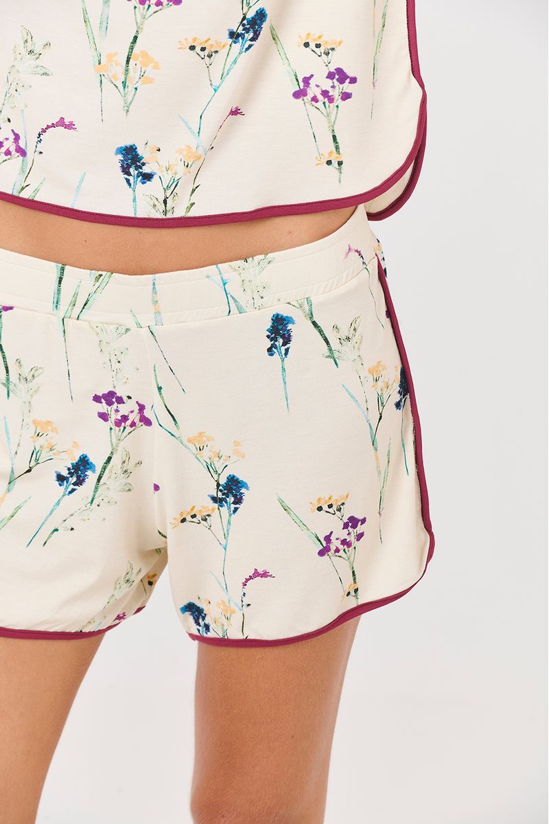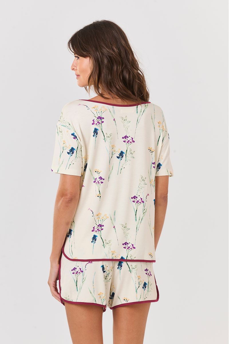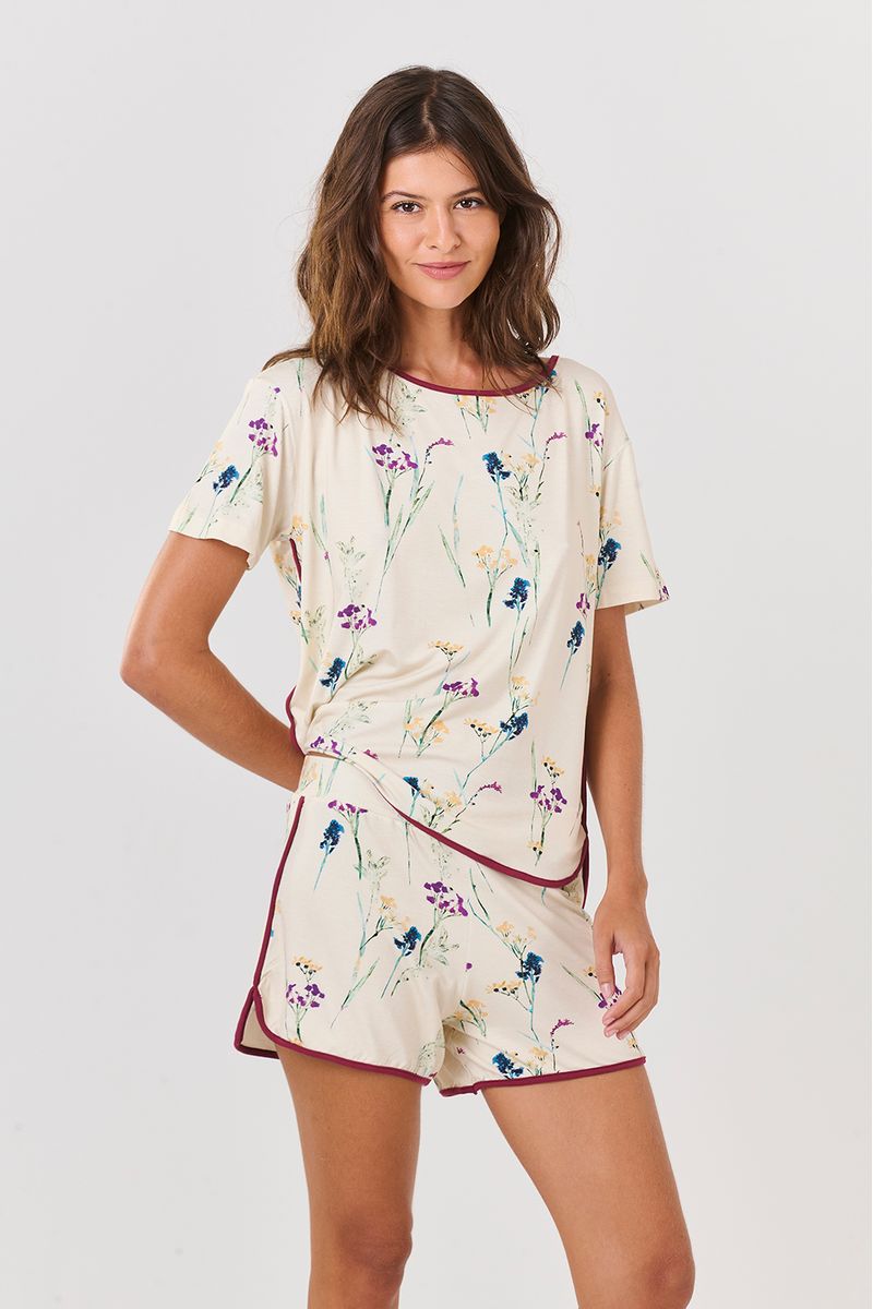 A t-shirt tem modelagem confortável, mangas curtas e acabamento em vivo contrastante, que emoldura a peça e traz um detalhe delicado de cor. O short acompanha a mesma proposta de conforto, com cintura confortável e caimento leve, além do vivo na barra, criando um visual harmônico e bem acabado. A estampa Ikebana, com flores delicadas, reforça a estética leve e feminina do conjunto.
