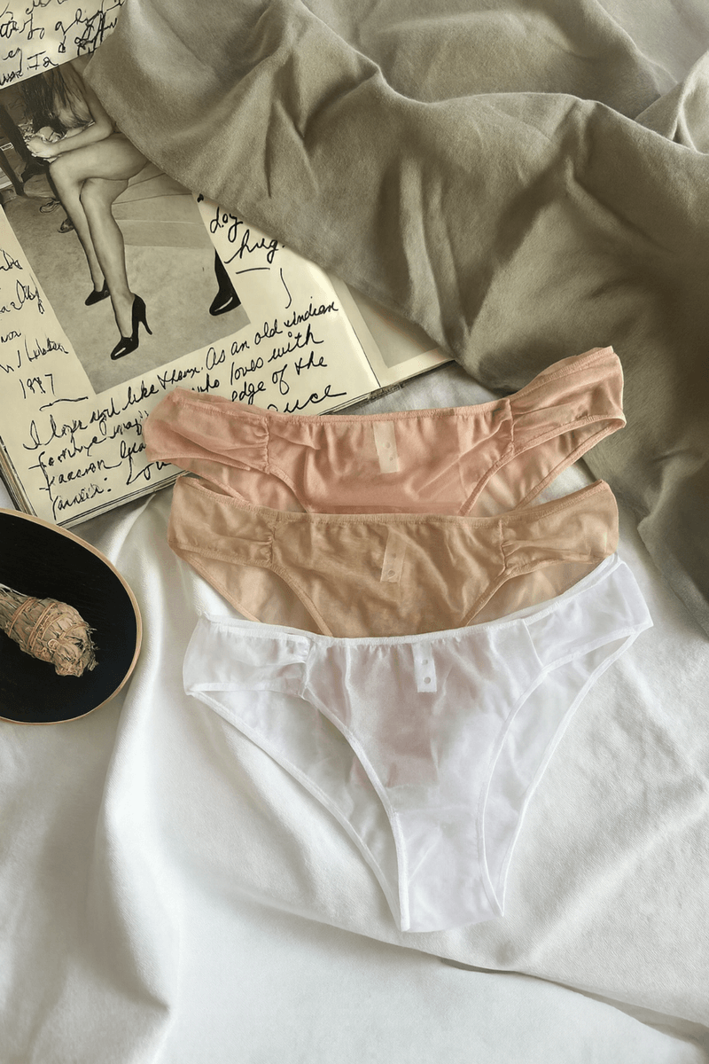 Kit com três calcinhas modelo média em tule leve e macio, nas cores Branco, Chocolate e Rosa Pele. O caimento confortável abraça o corpo suavemente, com transparência delicada e acabamento que não marca.