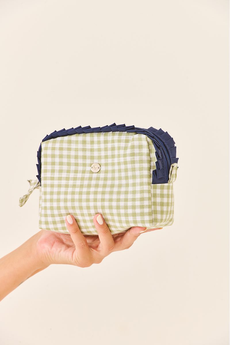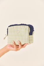 Necessaire prática e moderna, confeccionada em tecido vichy verde com acabamento delicado. Possui detalhe em passamanaria azul-marinho no zíper, que adiciona charme ao visual. Estruturada e resistente, é perfeita para organizar maquiagem, skincare, acessórios ou itens do dia a dia. O tamanho funcional e o fechamento em zíper garantem praticidade — ideal para levar na bolsa, na mala ou manter tudo arrumado com estilo.