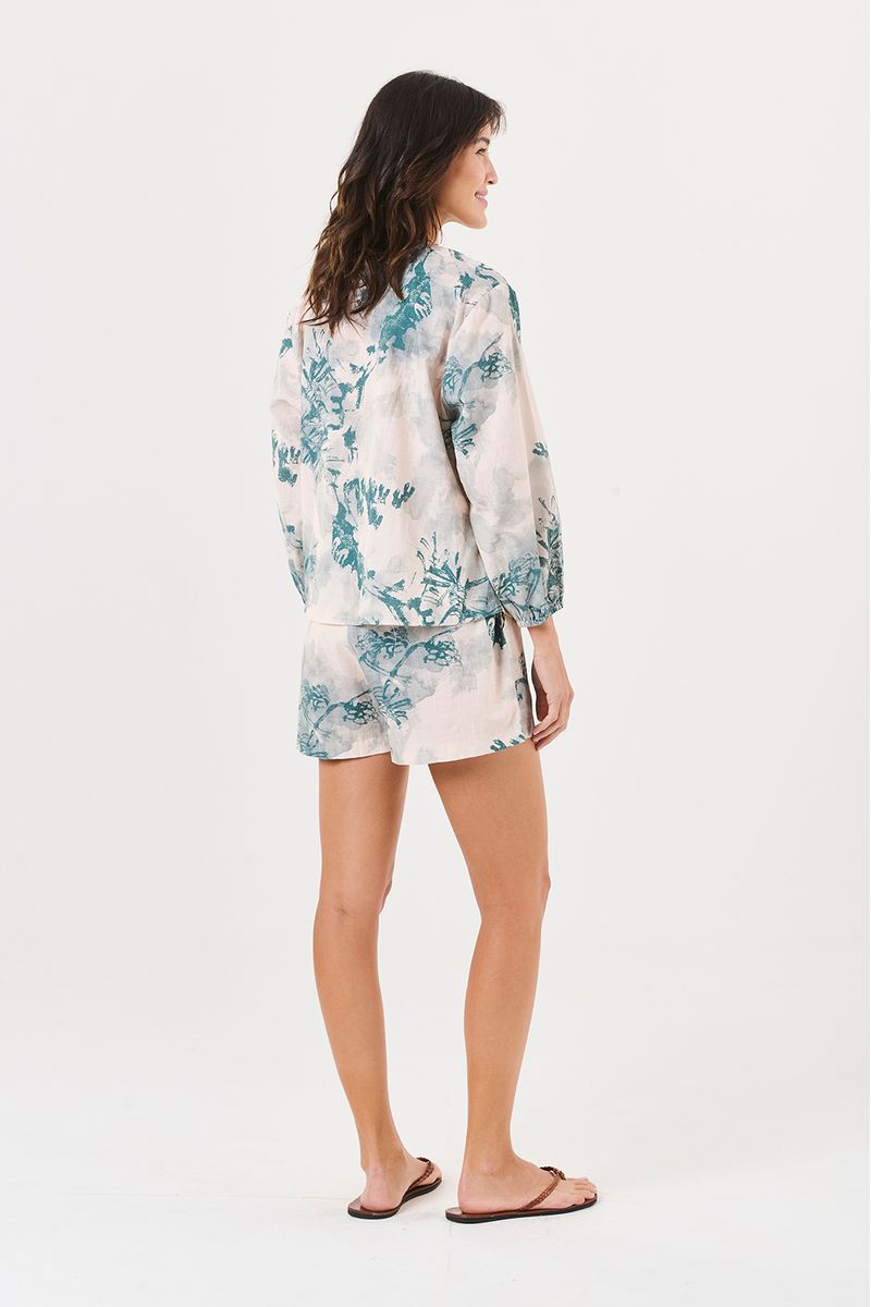 Composto por blusa de manga 7/8 e short, o conjunto traz uma modelagem soltinha que proporciona frescor e liberdade de movimento. A blusa se destaca pelas mangas levemente bufantes com punho ajustado, além do abotoamento frontal que adiciona charme e praticidade ao vestir.