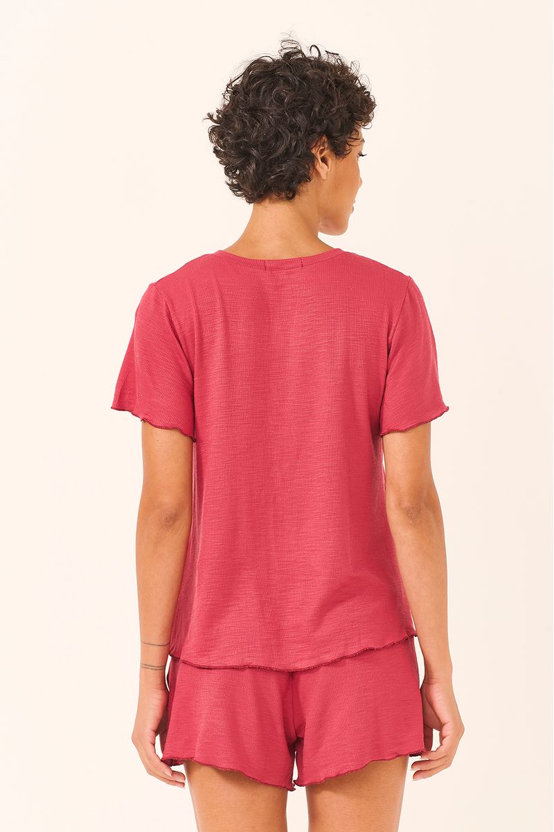 Pijama Curto Botões Flamê Rosa Goiaba em malha leve e macia, com toque fresco e confortável. A blusa possui abotoamento frontal e gola clássica, enquanto o short tem cós elástico e modelagem soltinha. Um conjunto prático e delicado, ideal para noites de descanso ou para relaxar em casa com estilo.