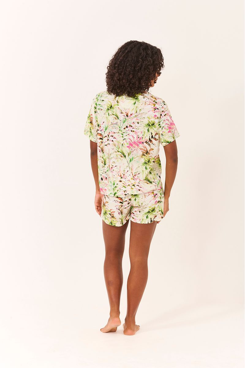 Pijama curto Juçara, com estampa inspirada na vegetação exuberante da Mata Atlântica. Feito em tecido leve e macio, o conjunto une frescor e elegância com modelagem soltinha e toque acetinado. A camisa de mangas curtas tem caimento fluido e botões frontais, enquanto o short acompanha com cintura confortável e recorte moderno. Um convite a noites leves e manhãs preguiçosas — perfeito para vestir natureza e conforto dentro de casa.