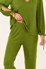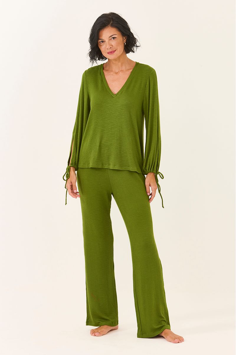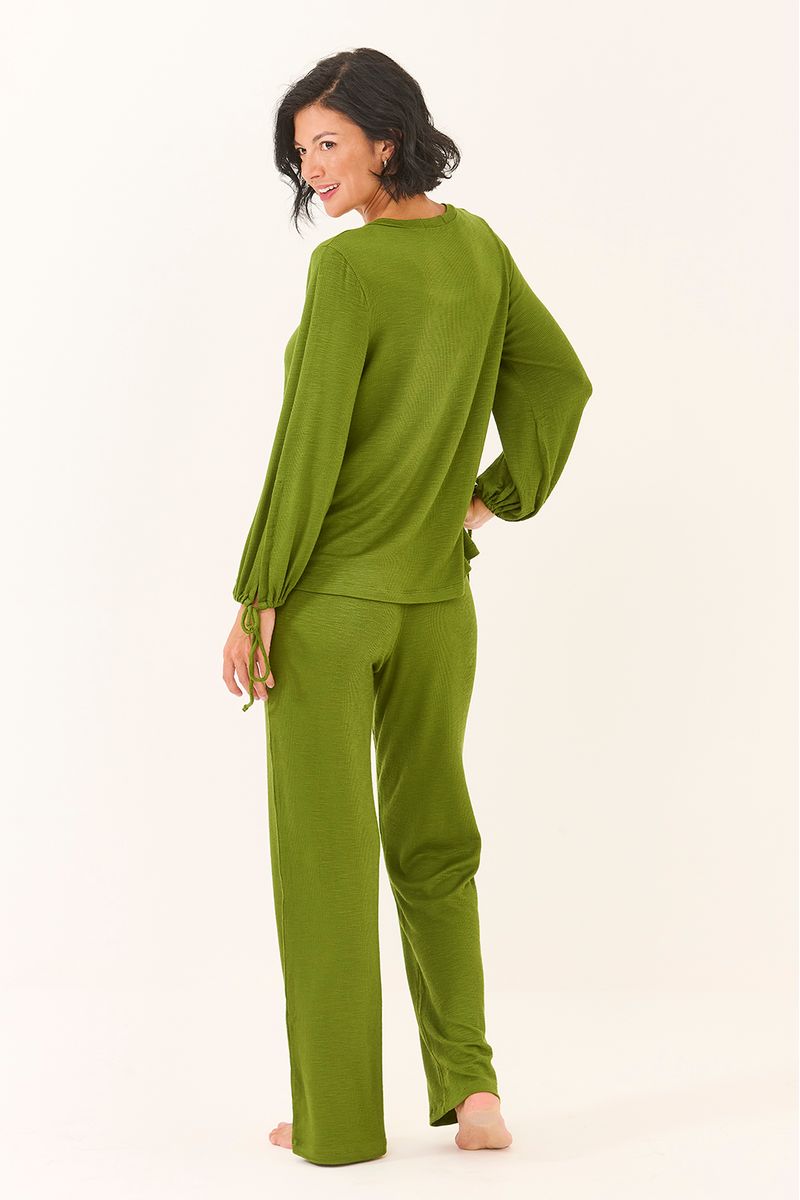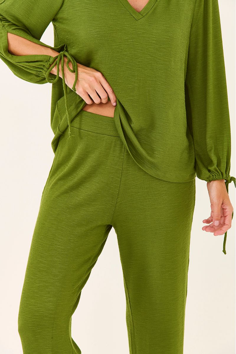 Conforto que abraça e cor que inspira. O conjunto longo em malha flamê tem blusa com decote V e mangas amplas com amarração delicada nos punhos — um detalhe que adiciona leveza ao visual. A calça tem caimento soltinho e toque macio, perfeita para momentos de descanso com estilo. Na cor Verde Mata, é um convite a relaxar em sintonia com a natureza.