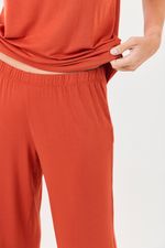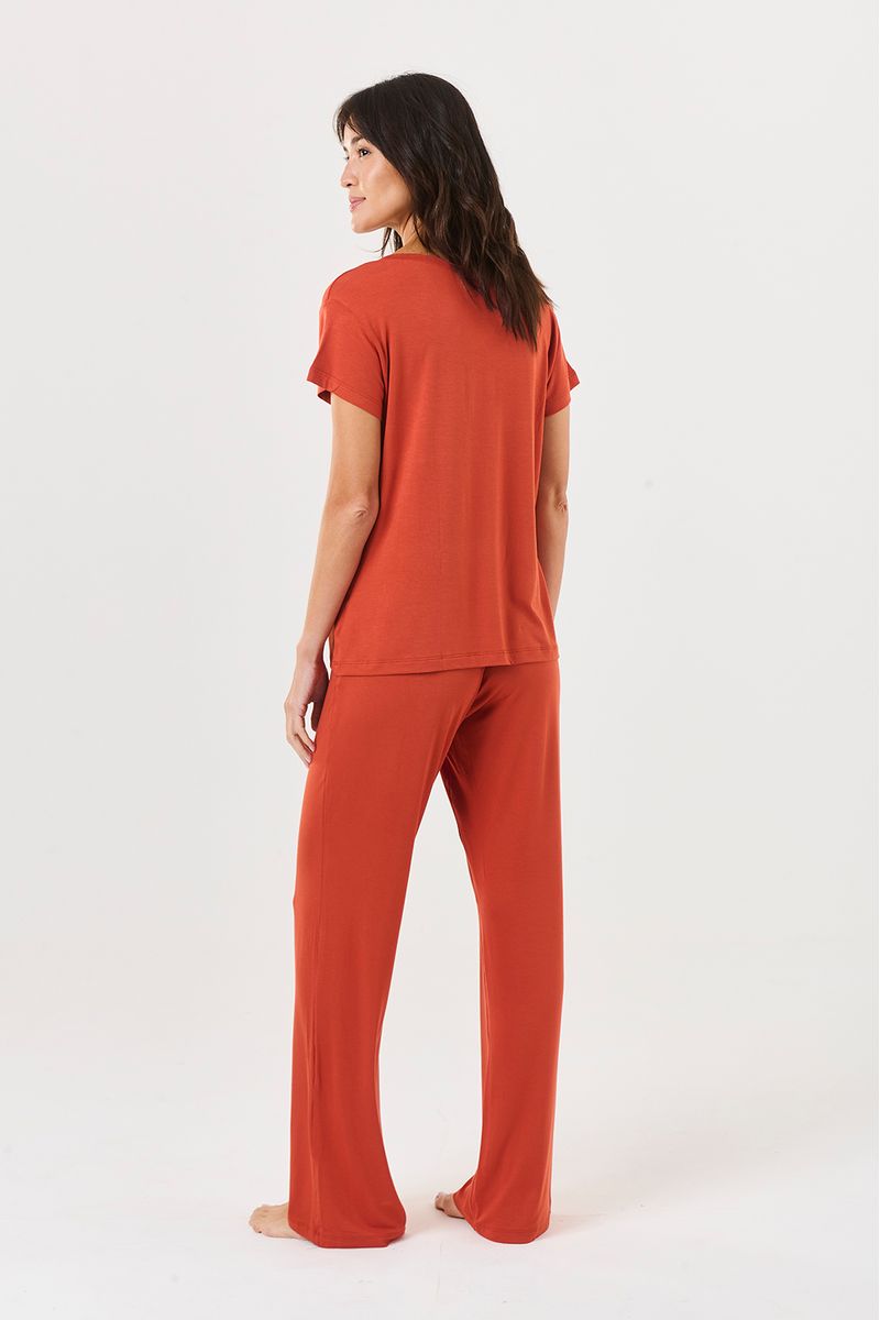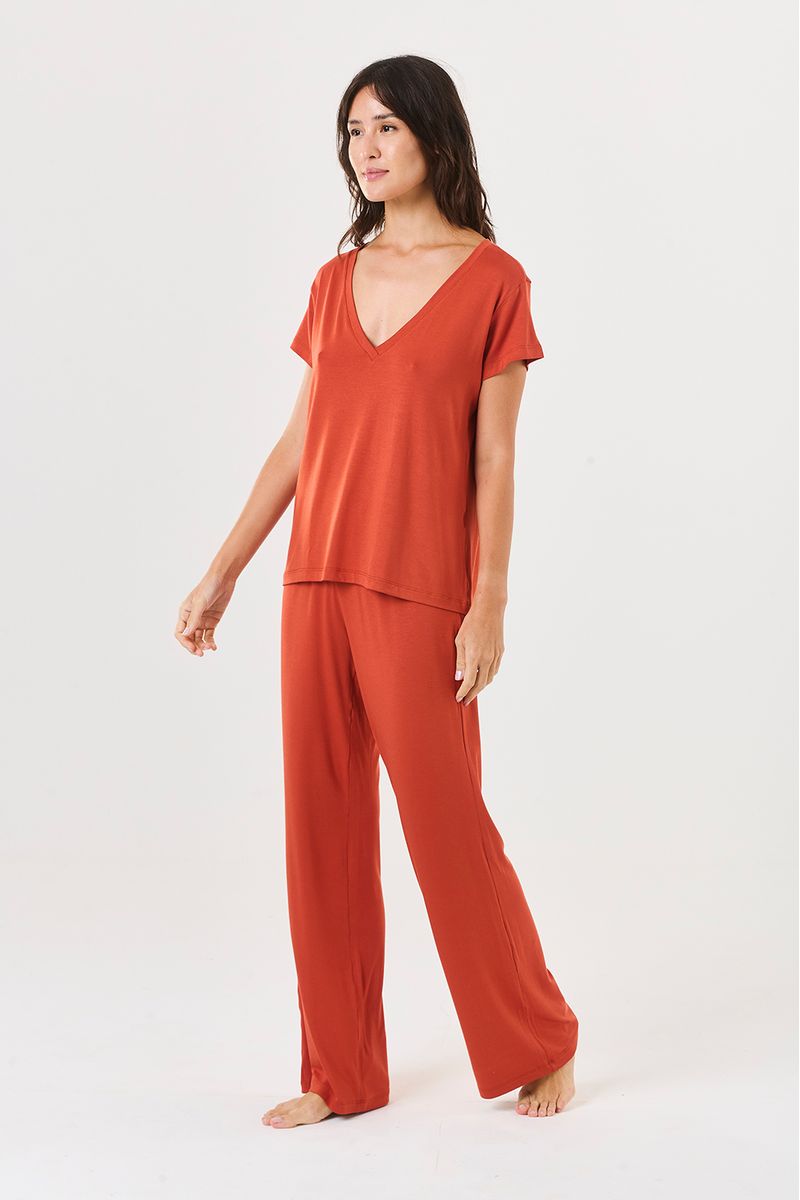 A blusa com decote em V valoriza o colo de forma delicada e traz leveza ao visual, além de proporcionar mais frescor e liberdade ao vestir. A calça longa complementa o conjunto com ajuste confortável e modelagem que acompanha os movimentos sem apertar.
