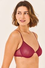 O sutiã é em tule duplo na cor bordô que chamamos de Sensuale, tem fecho com três casas e alças ajustáveis, que em tamanho menor, tem alças finas e em tamanho maior, alças largas.