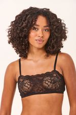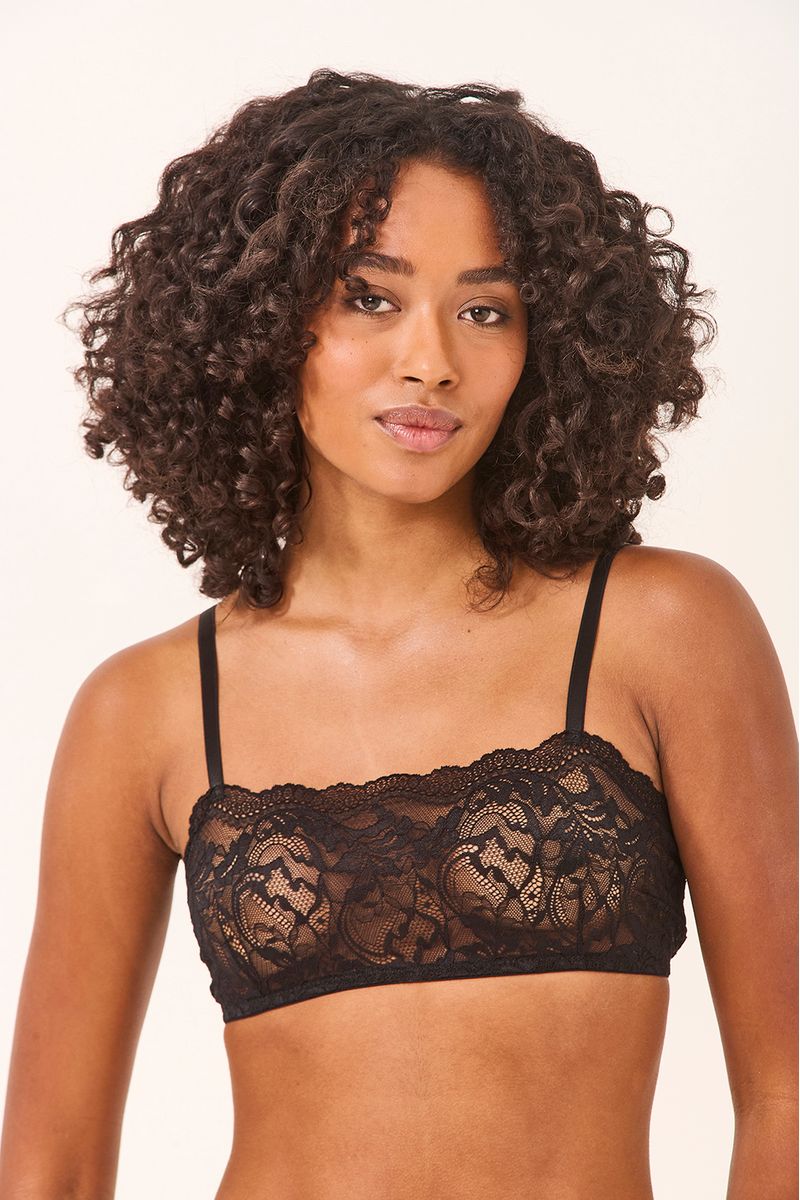 Sutiã em renda preta, sem aro e sem bojo. Modelo faixa com alças fixas e ajustáveis. Ideal para compor suas roupas decotadas.
