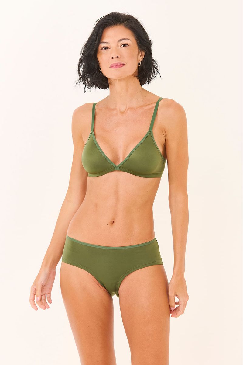 Com design limpo e toque esportivo, o sutiã triângulo em poliamida verde mata oferece sustentação leve e conforto absoluto. A modelagem sem bojo acompanha os movimentos com suavidade, enquanto o tecido fresco e respirável garante bem-estar o dia todo. Perfeito para quem busca praticidade com estilo.