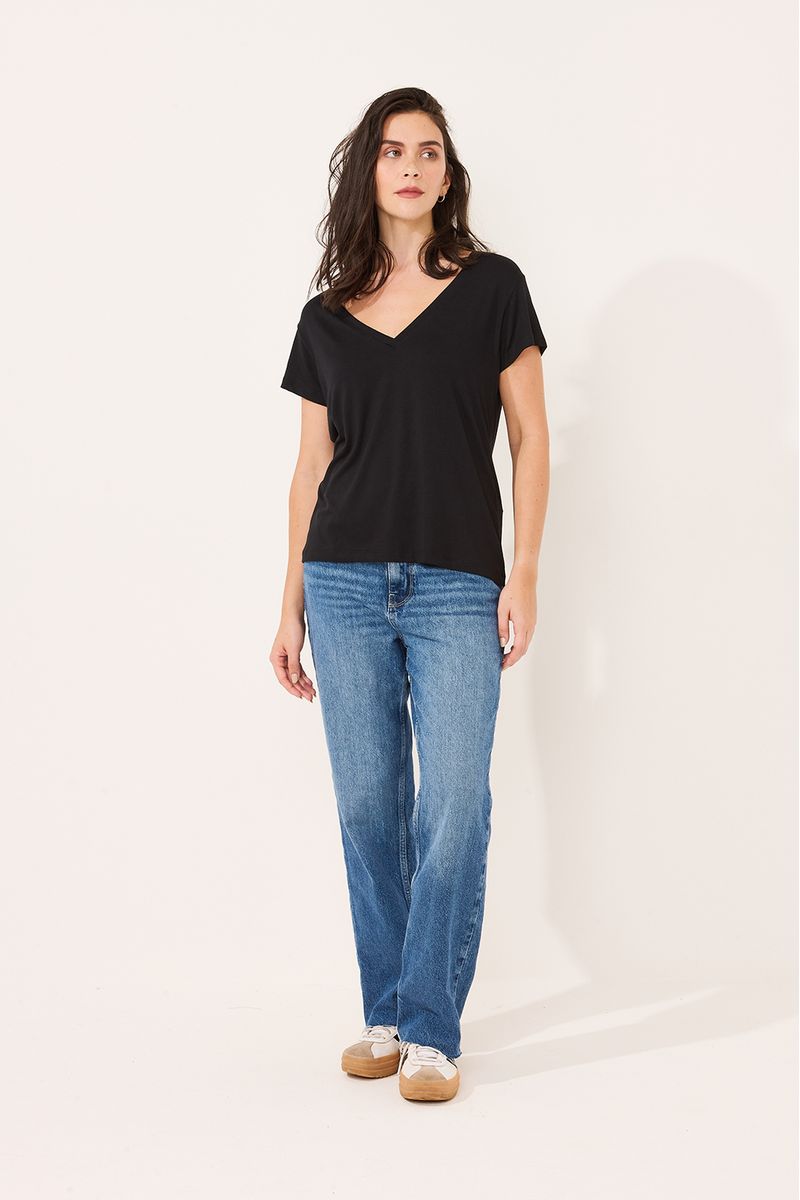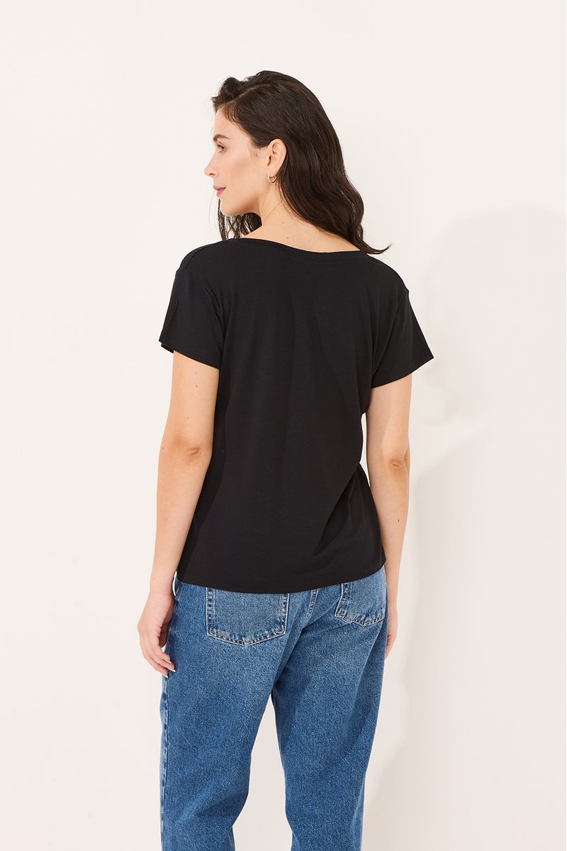 A t-shirt é confeccionada em viscose com toque de linho e elastano. Efeito malha podrinha.